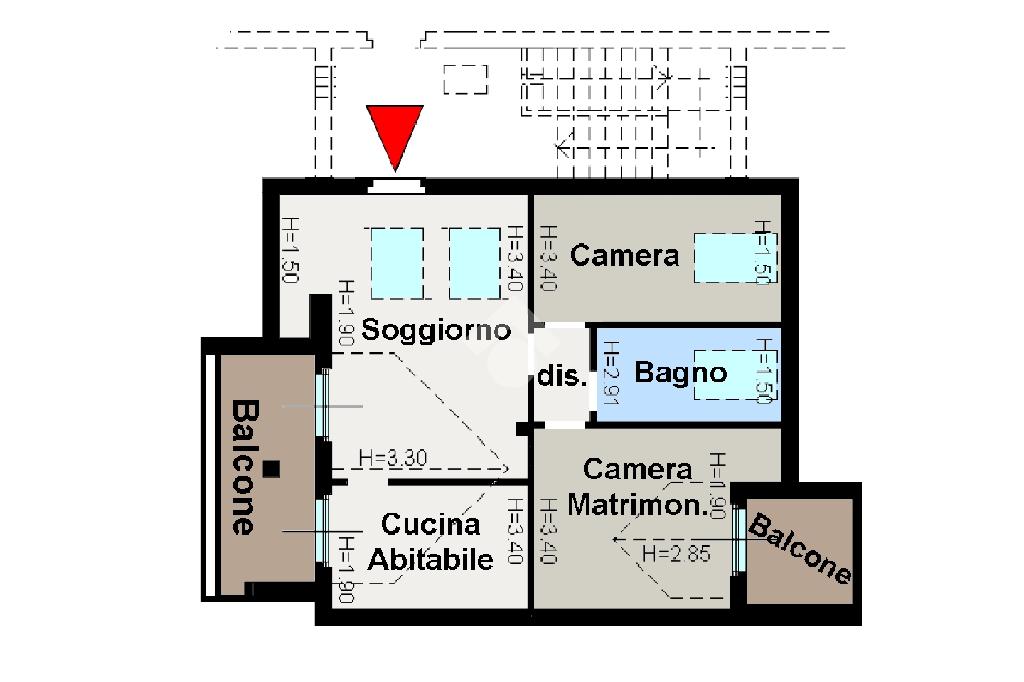 Internamente la distribuzione prevede uno SPAZIOSO SOGGIORNO e la CUCINA ABITABILE con entrambi gli ambienti con porta-finestra di collegamento con il COMODO BALCONE; dal disimpegno della zona notte si ha accesso alla camera matrimoniale con secondo balcone, al bagno e alla seconda camera da letto.