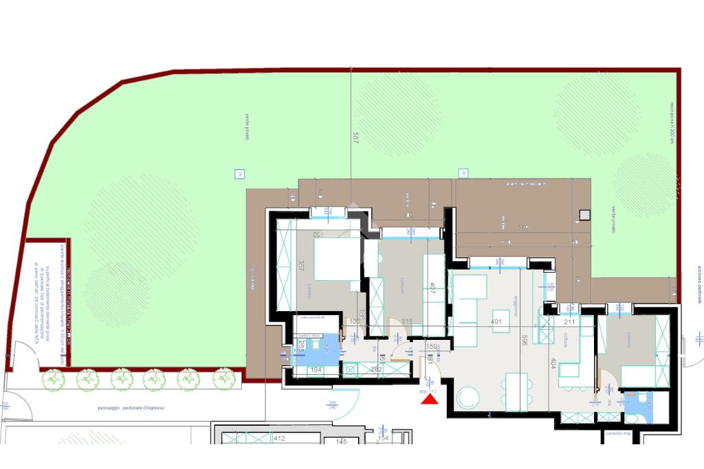 Appartamento al piano terra di quattro locali con ampio GIARDINO PRIVATO di circa 200 mq con PORTICO di oltre 30 mq composto da zona living luminosa, camera matrimoniale, camera doppia e la terza camera, disimpegni con spazi funzionali da poter arredare e i doppi servizi.