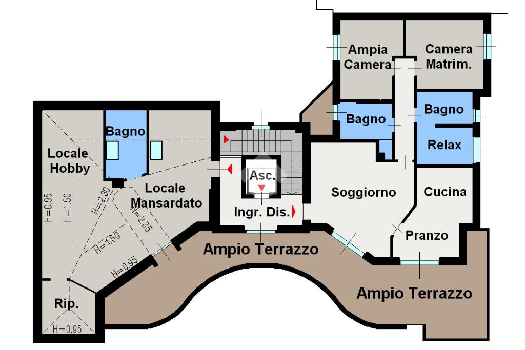 L'alloggio è composto dal disimpegno/pianerottolo privato a cui si accede tramite ascensore e scala privata che serve l'abitazione di 125 mq circa, il locale mansardato di circa 90 mq e il terrazzo di circa 65 mq.