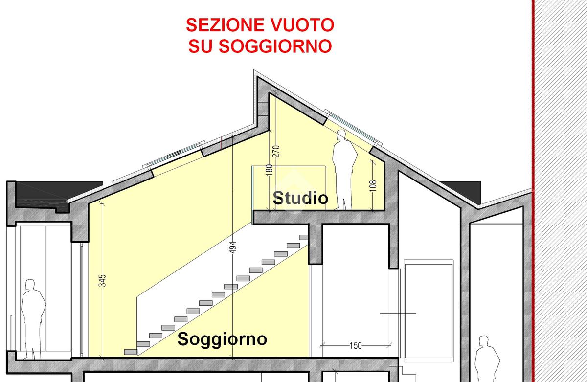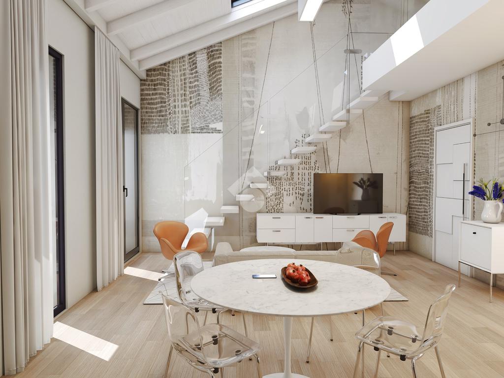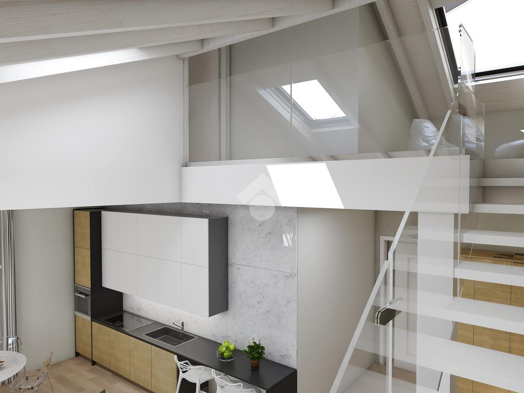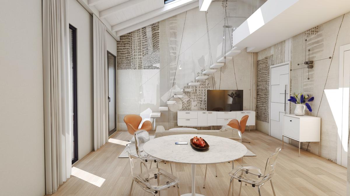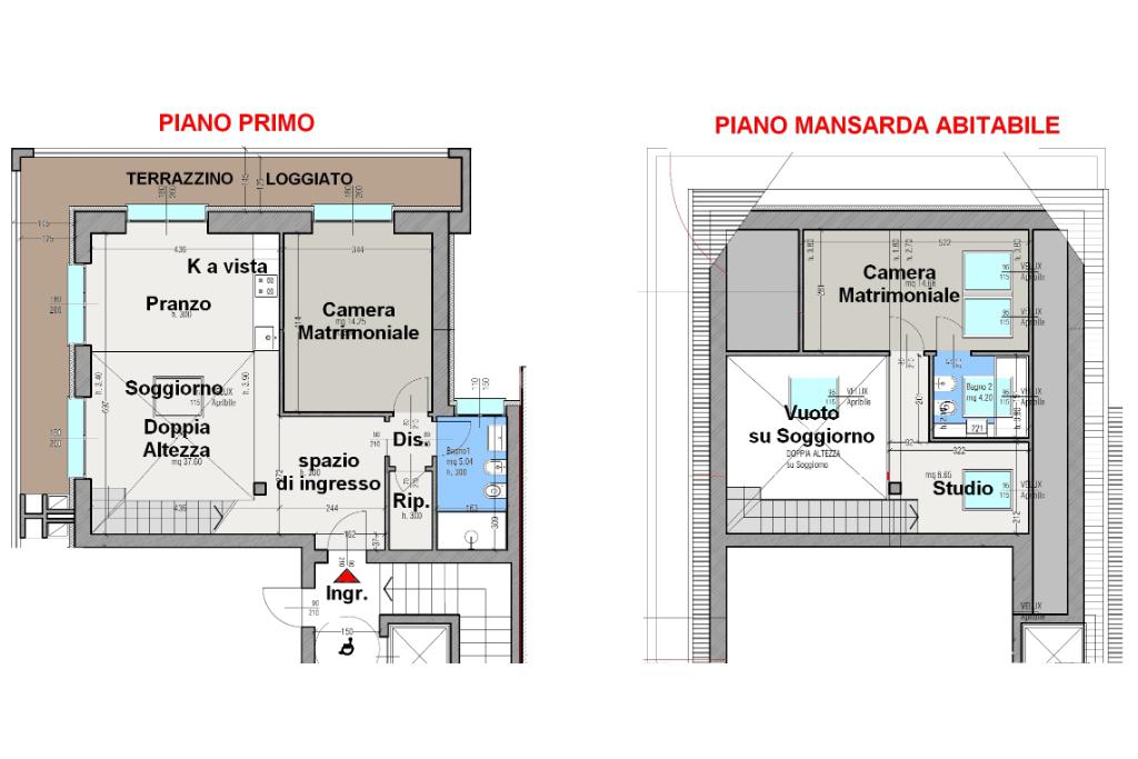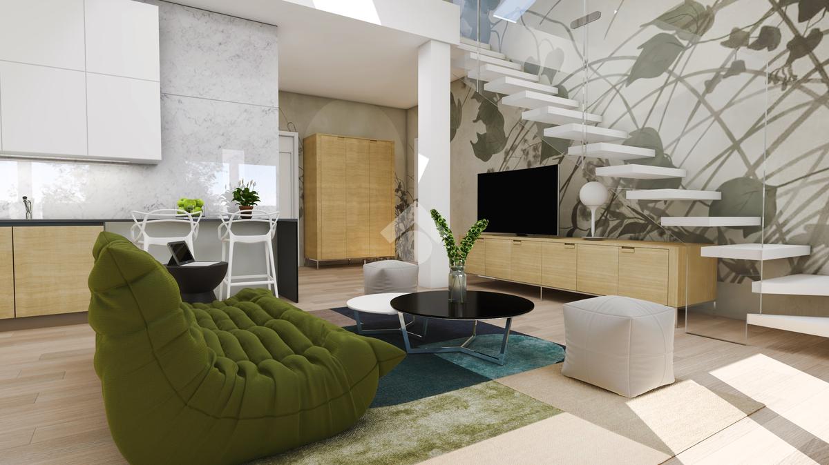 L' unità immobiliare al piano primo ed ultimo, servito da ascensore, presenta la caratteristica unica del suo genere della zona giorno a doppia altezza che serve una camera al piano con bagno, il tutto arricchito da una loggia angolare, e la seconda camera, il bagno e lo studio al piano superiore abitabile con affaccio sul soggiorno.