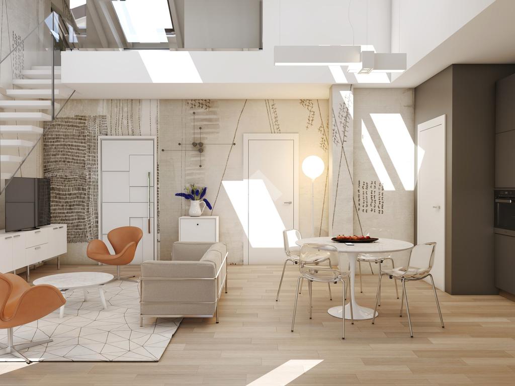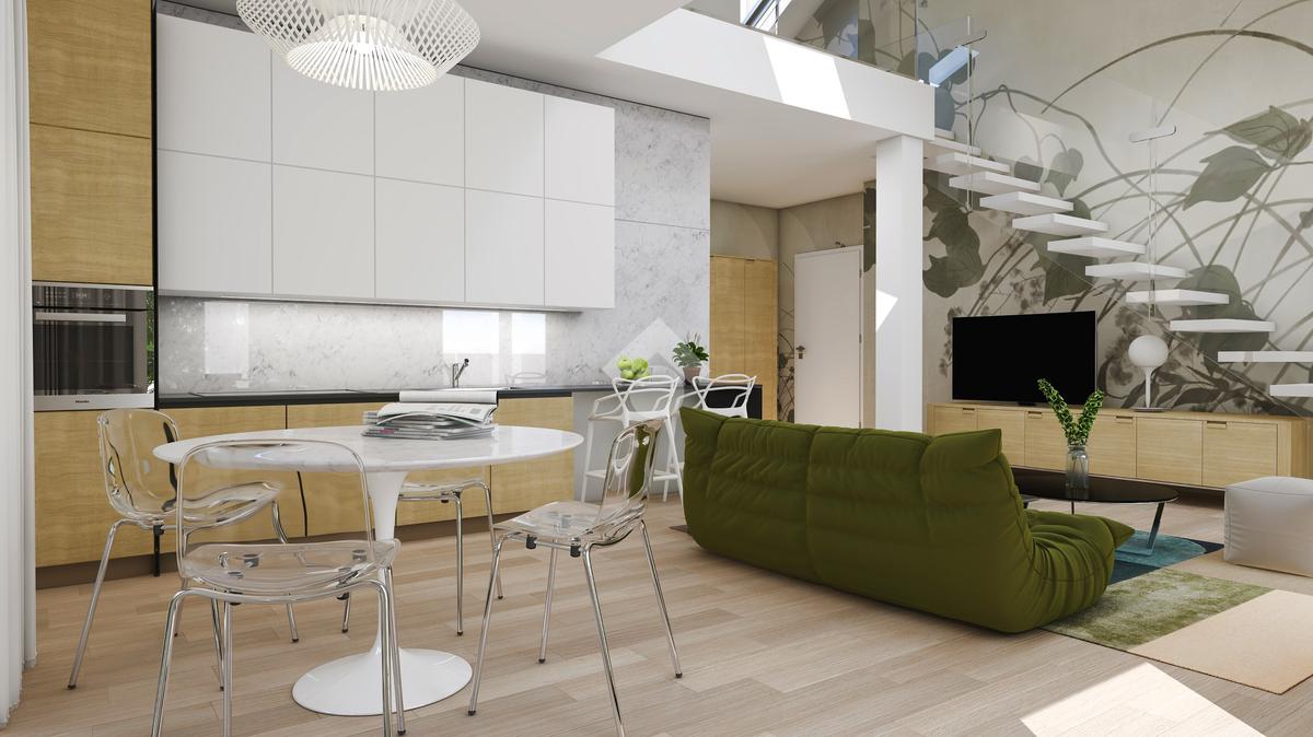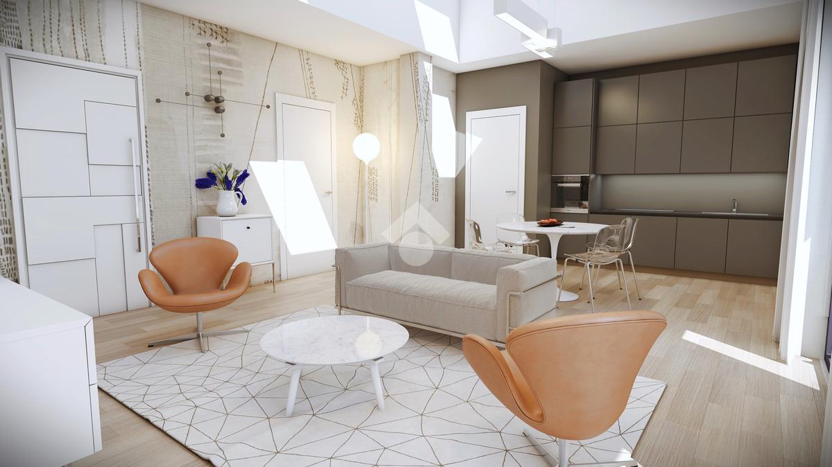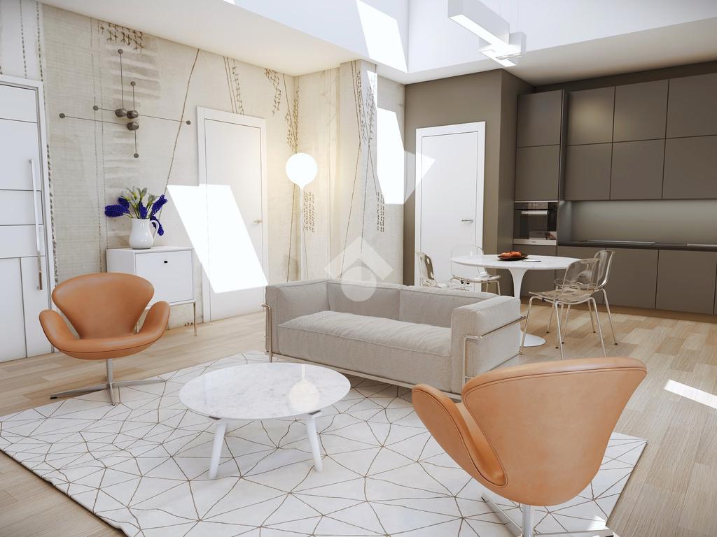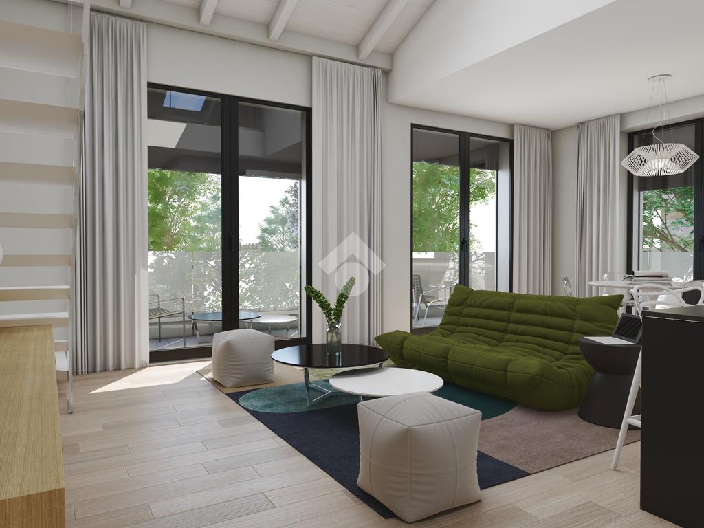 L' unità immobiliare al piano primo ed ultimo, servito da ascensore, presenta la caratteristica unica del suo genere della zona giorno a doppia altezza che serve una camera al piano con bagno, il tutto arricchito da una loggia angolare, e la seconda camera, il bagno e lo studio al piano superiore abitabile con affaccio sul soggiorno.